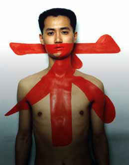 "In this work a red Chinese character was painted on the body and the wall, the meaning of the character is 'No!'. It covers the bound between body and wall. The illusion is used here to discuss the relation between an image and its background - how an image lost its independence and integrity by the extrinsic power."