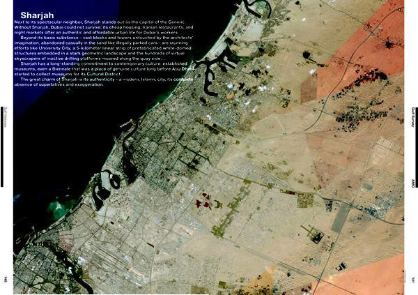 SHARJAH 거대한 도시 주변에 위치한 Sharjah는 보편적인 수도로써 돋보인다. Sharjah가 없었다면 Dubai는 생존할 수 없었을 것이다. 값싼 주택, 이란 레스토랑, 야시장 등은 두바이의 근로자들에게 필요 충분한 도시 생활을 제공한다. 건축가의 상상력이 미치지 못한 기본적인 방대한 블록과 타워들은 불법 주차 차량들처럼 사막에 이리저리 버려져 있는데, 이러한 경관은 대학 도시처럼 놀라움을 보여준다. 이들 구조물은 공장에서 제작된 흰 돔 구조물로 5km의 직선 띠를 형성한다. 이 구조물은 엄격한 기하학적 랜드스케이프로 수백 개의 가상 고층건물들은 부두에 정박된 정지된 시추 플랫폼과 흡사하다. Sharjah는 현대 문화를 지속적으로 수용하고 있다. 기존의 박물관들, 심지어는 Abu Dhabi가 그 문화 지대를 위해 박물관들을 유치하기 훨씬 이전에 순수 문화의 장이었던 비엔날레도 그 예이다. Sharjah의 커다란 매력은 그 정통성, 즉, 현대적인 이슬람 도시라는데 있다. Sharjah에서 최상과 과장이란 찾아볼 수 없다. | |||