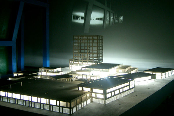"Video Zendai" - Model of Zendai Plaza in Shanghai made of wood and acryl, 5 video cameras, a video projector, 3 motors, 2005